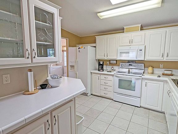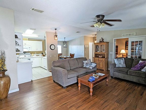 3 Bedroom | 2 Bath | 1,286 sq ft | $116,000 Welcome to your move-in-ready home: Four Lakes Lot 798! This 3 bedroom, 2 bath doublewide boasts a unique split floor plan complete with office, pass-through kitchen, and Florida Room. Step into the freshly painted main living area, which feels warm and inviting. The living room flows seamlessly into the master suite, which boasts a spacious bathroom complete with a skylight and walk-in shower-your personal retreat! The kitchen features tile floors, ample counter space, and all-white appliances. The sink area opens to the dining room, making entertaining a breeze. Just off the kitchen, you'll find a convenient laundry room and pantry. Double French doors off the living room lead to a cozy office space, which connects to a delightful Florida room through sliding glass doors. This sunny spot is perfect for morning coffee or evening relaxation and even provides access to your driveway. Guests will love the private hallway leading to their bedroom and bathroom, while the backyard offers a unique view of green space, backing up to neighboring yards for a peaceful, open feel. Recent updates include a brand-new roof (2023) and a new A/C system (2024, and here's the cherry on top: the purchase includes a golf cart and one year of free golf!