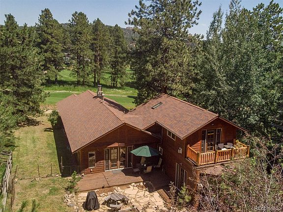 True Evergreen Mountain Home updated to serve your modern lifestyle. Just steps from the Evergreen Golf Course which is also an unofficial nature sanctuary. Multi-pane and picture windows draw in bright natural light and views of all 4 seasons. Vaulted T&G pine ceiling and river rock fireplace complemented by log accents and pine trim framing windows and walls. Updated kitchen boasts ample storage in solid wood cabinetry, granite counters, and updated appliances. The entire upper level is a private master hideaway complete with full bath, walk-in closet, and outdoor balcony. Excellent floor plan allows for spacious rooms that retain history and character. Adorable storybook home with extensive glass including multi-pane french doors. Two separate entry areas welcome boots & mittens. Covered front porch is the ideal spot for sunsets, wildlife watching, and front row gallery seats at hole 16. Towering pine trees stand guard over this quiet oasis with a grassy & level fenced-in backyard play area and flagstone patio. Major addition/remodel completed in 2003. Quiet county maintained street and short / level driveway. Awesome central location is an easy walk to paddling & ice skating on Evergreen Lake and Alderfer 3 Sisters hiking & biking trails. Easy trips via car or foot to: restaurants, live entertainment, shopping, services, and schools. Deer, Elk, and fox frequent the yard and an occasional Bear will meander by. No restrictive covenants or HOA allow for full enjoyment of your property. Yes, it is definitely cooler 1,874 feet above the Mile High City so Move up to EVERGREEN and start enjoying the Colorado sunshine, fresh air, wildlife, and abundant trees, where every day is a Rocky Mountain staycation! SEE MATTERPORT 3D INTERACTIVE TOUR (virtual tour icon (movie reel) see upper left by map & ! icons). Evergreen Golf Course info:https://www.cityofdenvergolf.com/evergreen-golf-course/