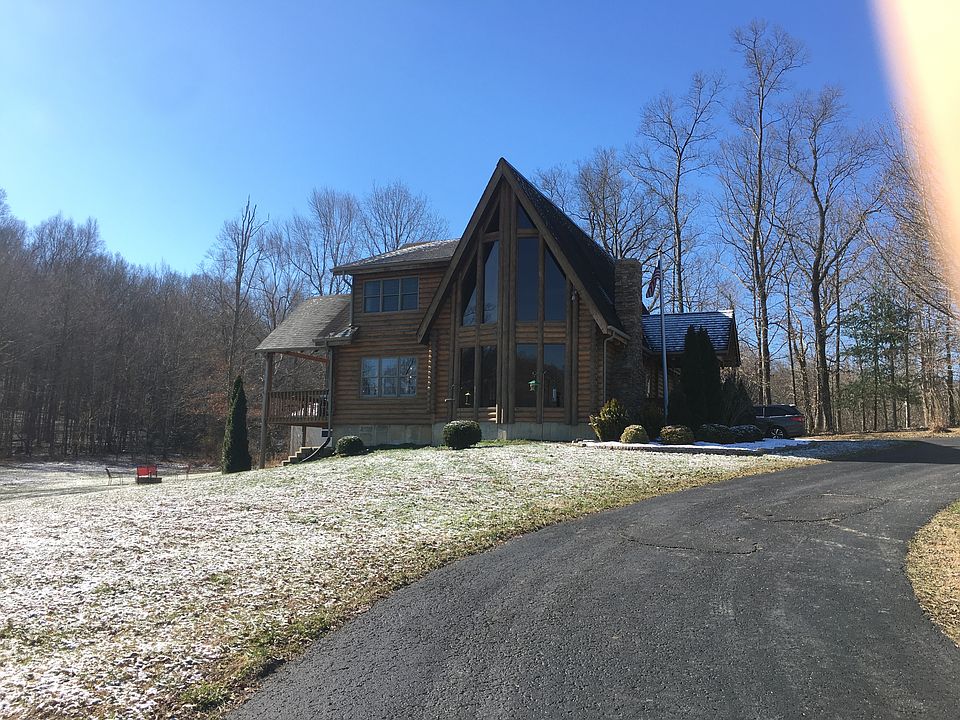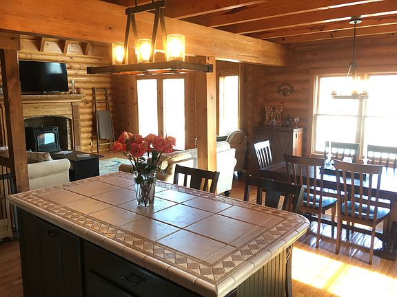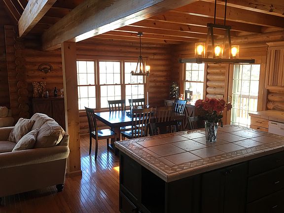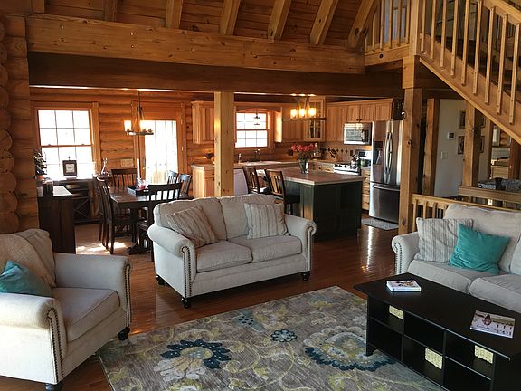 Amazing Log Cabin on over 3.5 acres! Gorgeous open 2 story Living Room with Floor-to-Ceiling windows, exposed beams and pellet stove fireplace. Living Room opens to Kitchen and Dining Area. 2 bedrooms and full bathroom complete the main floor. Upper level Master Suite with stunning soaring ceiling. Loft Family Room provides extra lounge space. Huge finished walkout basement features entertainment room, 4th bedroom, laundry room and full bath. Tons of deck space allows you to enjoy the beauty of over 3 acres including a private pond and fire pit. Attached 2.5 car garage, Detached 2.5 car garage and 30x40' Outbuilding completes this amazing estate!