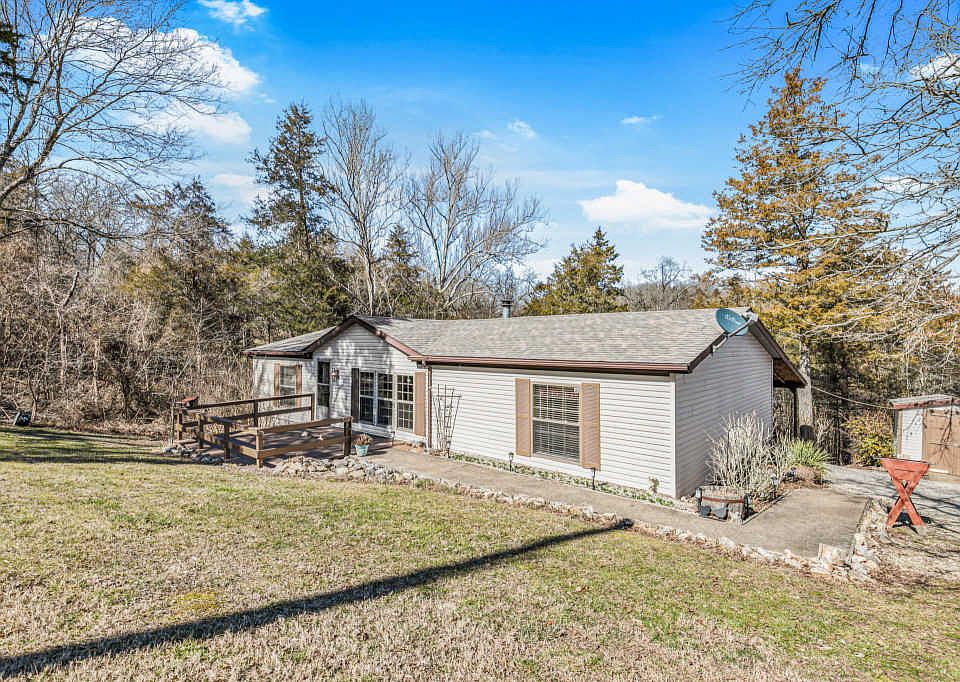 Well maintained 3 bedroom, 2 bathroom home near Lake Taneycomo! Offers spacious living room with wood burning fireplace, dining room, and kitchen with breakfast bar, abundance of cabinet space, new dishwasher and skylights. Master bedroom has a walk-in closet and remodeled master bathroom featuring dual sink vanity, soaking tub with skylight above and walk-in shower. There are two additional, nice sized bedrooms, full bathroom and laundry room. Home has multiple decks that overlook this 1.1 acre lot plus two storage sheds, attached carport, and several trees including peach and apple trees! New roof & siding (1.5 yrs old). New plank flooring and some carpet . Sits on a permanent foundation and has a vapor barrier. Call to schedule your private showing today!