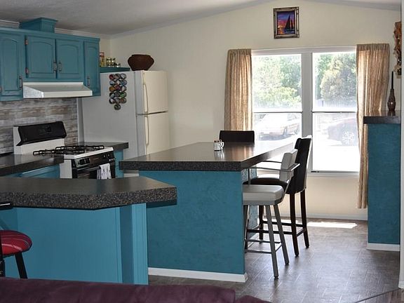 Very Well Maintained Mobile Home with Land! Great curb appeal that complements the interior as this home features a nice open concept with Large Kitchen, an Island, as well as a breakfast bar, plus a dry bar where built in microwave is located - great for entertaining! Very nice sized Living Room with easy to care for flooring throughout. Full bath features porcelain tile flooring and jetted tub. This 2 bed, 1 bathroom provides affordable living in Pueblo West. A portion of lot is fenced providing a nice back yard area and front yard that is easy to maintain. Also, with a 1 car carport and 2 sheds. All appliances are included and in working condition, but being sold as is. Please note there is a dryer hook up next to the washer, but a dryer is not included.
