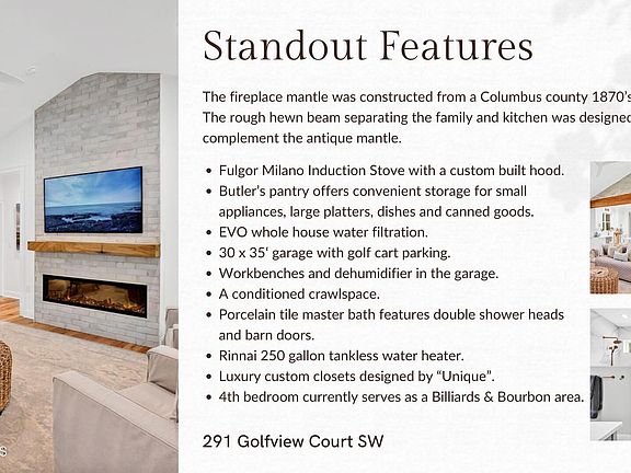 This stunning custom-built home, located on the 1st hole of the prestigious Lockwood Folly Golf Course, offers 2,700 sq ft of luxurious living space. Constructed with 2 x 6 framing, this house boasts light and airy features designed to illuminate the details and complemented by a beautiful outdoor seating area. The fireplace mantel is over a 100 years old, anchored by a rough-hewn beam that adds symmetry and charm. The kitchen is equipped with a Fulgor Milano induction stove, a Custom-built hood, Brizo kitchen faucets and an EVO whole-house water filtration system. A ''Thin Q LG'' Refrigerator that produces 'whiskey' ice cubes is a fun bonus. The flooring features 5'' engineered hardwood floors. The Custom window treatments are enhanced with extra-wide crown molding. The Split floor plan has an open concept, to display the spaciousness of the home. The Master Bath has a large porcelain tile shower with double shower heads and a master closet designed by ''Unique's,'' even the half-bath features elegant inlaid marble flooring. The Master BD, 2nd Bedroom, kitchen, family room and the outdoor covered porch offer panoramic views of the golf course. The 4th Bedroom is located upstairs, and currently used as a 'mancave' room, complete with a wet bar, but can easily be converted to a bedroom. The Garage is a 30 x 35 space with enough room for a golf cart, workbenches, and includes 2 oversized doors. The Outdoor shower, outdoor grill and Rinnai water heater are powered by an underground propane tank. *A generator could easily be added to the home using the propane tank. The Lockwood Folly POA & Country club with stunning views along the Lockwood Folly River & Intracoastal Waterway offers a pool, tennis & pickleball, a boat ramp, a fishing pier ,a pro shop, kayaking Plus RV & boat storage! This is a fantastic property that offers a unique blend of old Southern charm and modern luxury living for those who appreciate quality craftsmanship and beautiful surroundings. By Appt O