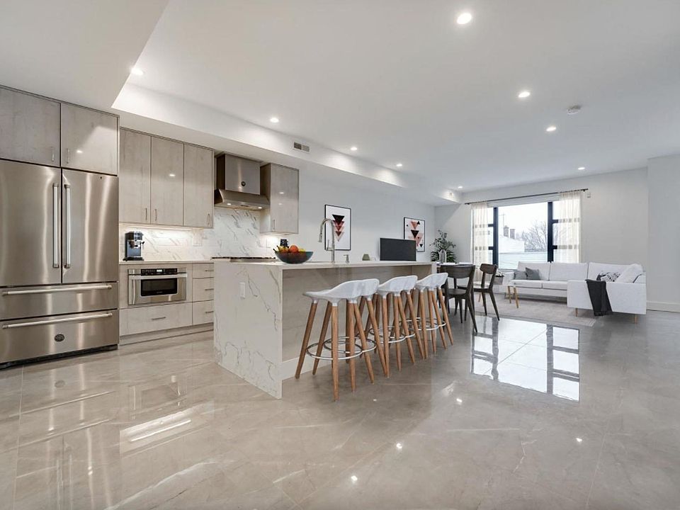 *Landlord pays 1/2 broker fee! * Absolutely huge home is available for rent in Jersey City Heights. Built in 2020, this three bedroom + two bathroom home offers oversized roofdeck, driveway parking and incredible location. Oversized space showcases large windows and beautiful marble flooring allowing for flowing floorplan with plenty of square footage for living, dining and eat-in kitchen. Chef-inspired kitchen features waterfall marbled quartz counters, matching tile backsplash and custom cabinets, plus top-of-the-line Bertazzoni appliances. Head upstairs to large bedrooms with ample closet space, and hardwood flooring throughout. Primary bedroom offers Juliet balcony opening to backyard, while bathrooms showcase double vanities, large mirrors and soaker tubs with shower niche. The oversized sized roofdeck gives wonderful access to outdoor living with panoramic views and a wet bar! Steps from Summit Avenue or Leonard Gordon Park, this home offers luxury living in an ideal location at it's finest.