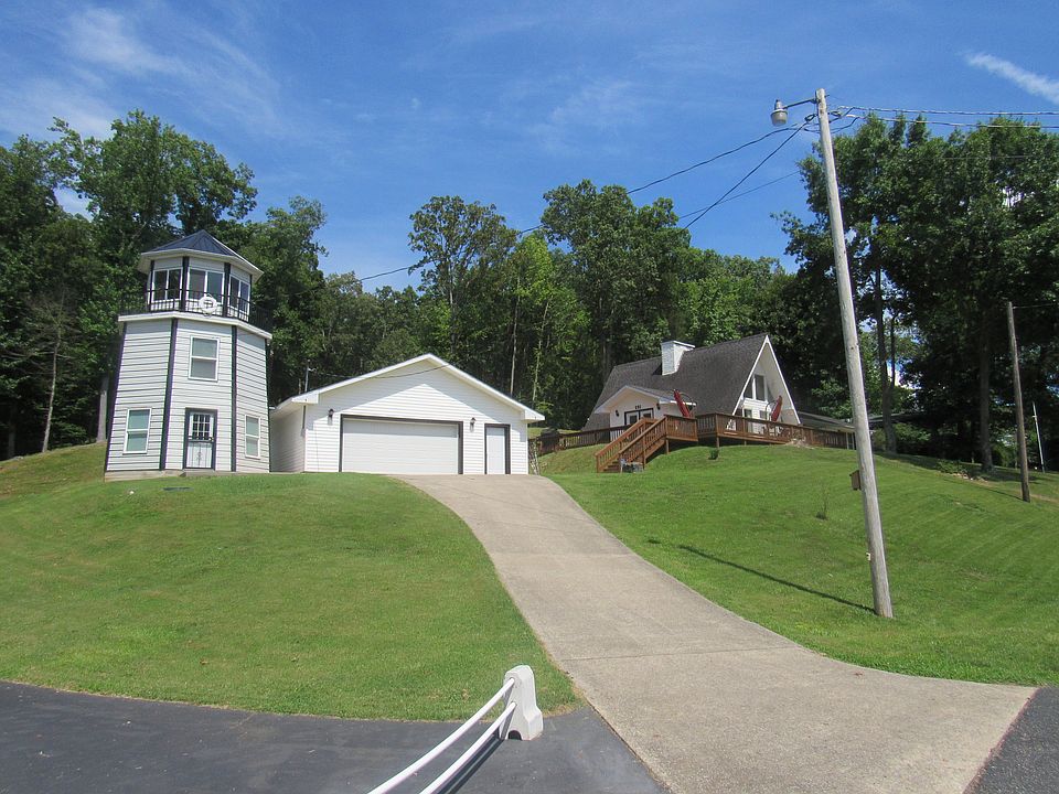 LAKEFRONT WITH DOCK ON THE MAIN CHANNEL BREATHTAKING VIEWS BRING YOUR TOYS Main home has 2 bd/1bath plumbing in place for master bath(2nd bath) gas log FP, NEW HVAC/duct work NEW insulation and drywall, wrap around deck, hot tub, Detached 2 car garage, Guest "Lighthouse" 1bd/1bath with a top observation room boasting panoramic view wrap around porch,XL RV barn with a full bath/laundry and its own septic ready for RV with hook ups to water and septic. Concrete boat ramp