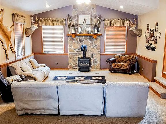 Stunning 2469 sqft 3 Br 2.5 bath ranch style home with a 3 car attached garage on 4.83 acres! Enter your new home into the beautiful sitting room that steps down into your huge cozy family room featuring a natural gas stove and gorgeous vaulted ceilings. The large wrap around kitchen located off of the family room has a lovely eat in nook looking out onto your 4+ acres. Make a game room or work from home in the extra room large enough to be converted into another bedroom or guest room.