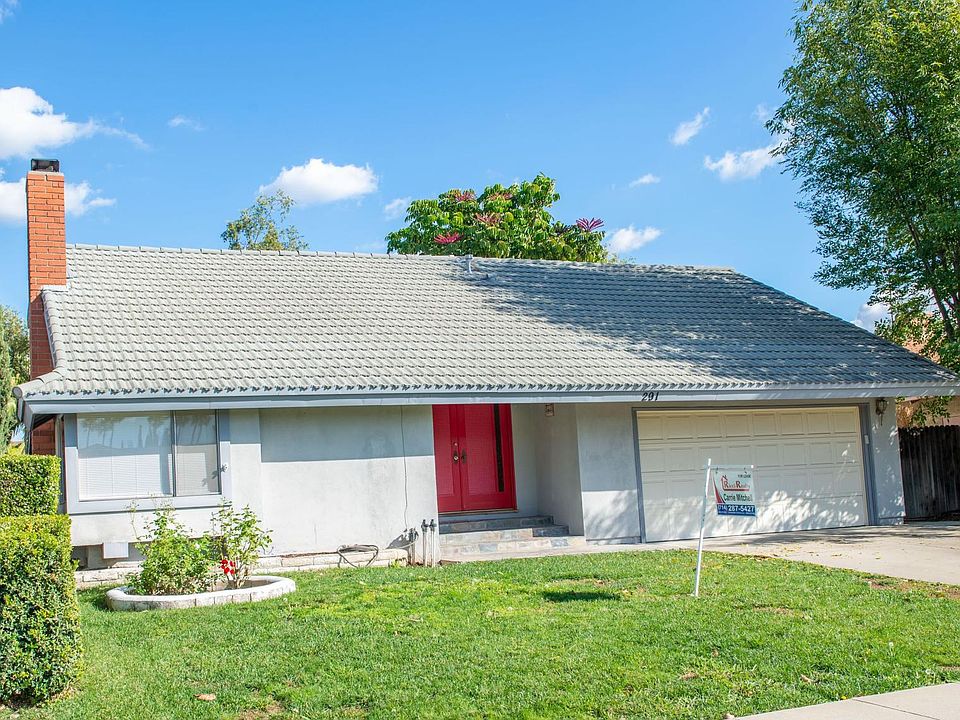 Large 4BR / 3BA house in a quiet neighborhood with convenient access to freeways. Dramatic entry into cozy sunken living room with gas fireplace and attached formal dining room. Family room / bonus room adjacent to sliding patio door to the back yard. Kitchen, with a view of the back yard, has white cabinets and tile counter top. 3/4 bath at lower level (porcelain flooring and granite counter top) is located between kitchen and large downstairs bedroom. Going up the newly carpeted stairway and landing area, you encounter a hallway full bath (porcelain flooring and granite counter top) as well as two large bedrooms in one direction and the master bedroom in the other. Most bedrooms have walk-in closets. Master bedroom has a new porcelain tile shower as well as porcelain floors and a granite counter top. Laminate flooring in all bedrooms, downstairs hall, living room, dining room and family room. Back yard has flower beds and several fruit trees. Storage is plentiful with many closets and cabinets as well as a large storage area upstairs. Inside of entire house has new fresh paint. Owner pays weekly gardener. Tenant pays gas, electric, water, sewer, trash, etc.