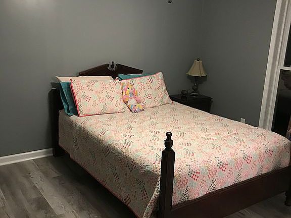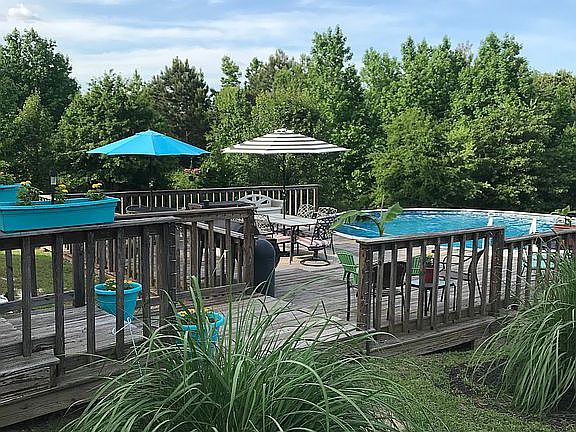 Ranch style home with a tin roof. Fully established landscaping with a large deck off back of house with above ground pool.