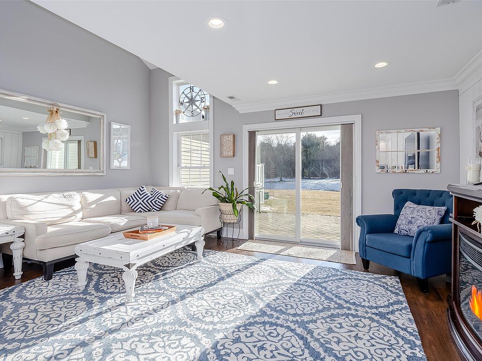 The remodeled eat-in kitchen spared no expense, boasting expanded quartz countertops, a breakfast bar, stainless steel appliances, mosaic tile backsplash, and soft-close white shaker style cabinetry. This space seamlessly flows into the dining and living areas, complete with sliding glass doors that open onto a picturesque rear patio.