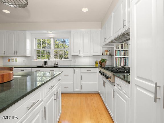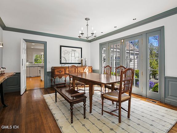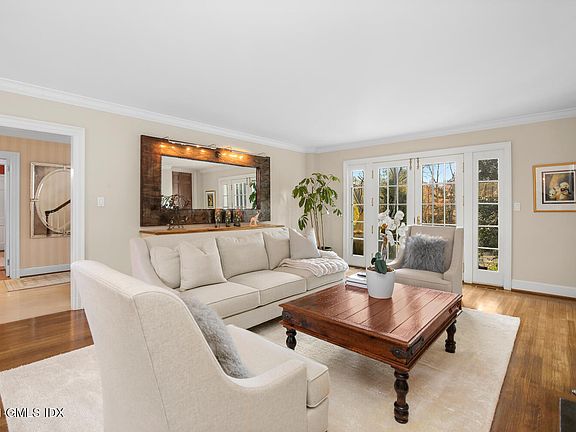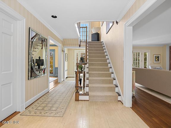 Stone and clapboard pre-war Georgian with thick slate roof, completely updated and expanded, on nearly 2 acres with beautiful landscape and heated pool. Front-to-back entry, charm throughout, lovely formal rooms with French doors to stone patio. Kitchen with walk-in pantry and large island is open to family room with soaring ceiling and fireplace. Elegant balcony on 2nd floor hall landing offers amazing vistas of the sweeping grounds. Master bedroom suite with oversized dressing area and double bathrooms. First floor guest suite plus separate outbuilding, perfect for home/away office, gym, art studio or guest house. New systems including HVAC and generator. Ready to move-in and enjoy the Round Hill Road lifestyle.