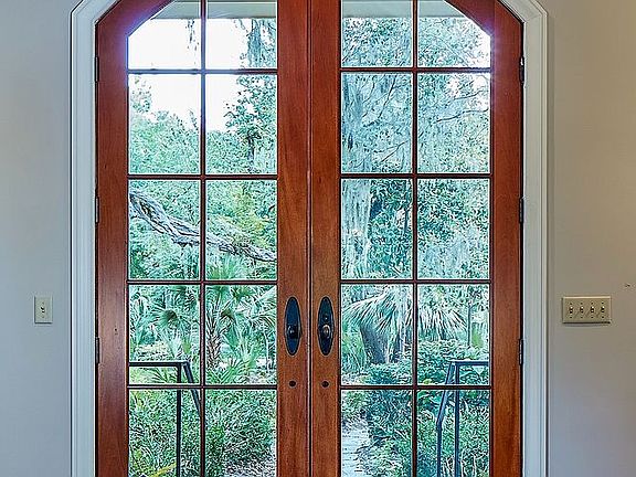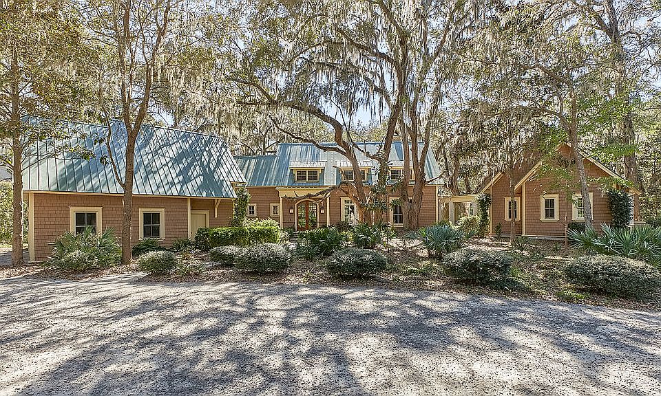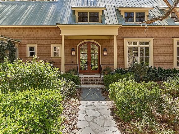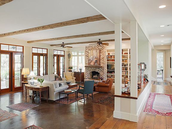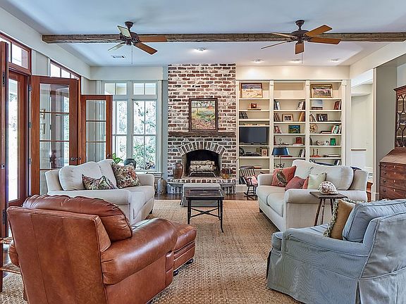 Perfectly sited within a live oak forest, this home designed by BRZ, Inc. uses windows and glass doors throughout to take advantage of the views of the surrounding landscape.The large great room features wood beams and wide board heart pine flooring recycled from a 1760's home in Virginia. A brick fireplace with raised hearth and built-in bookcases anchors one end of this grand room. At the opposite end, the dining area can accommodate large gatherings. The great room opens to a covered porch with skylights.A screened porch off the kitchen has a center island and a gas cook top. A large pantry and utility room provide wonderful storage. A library off of the great room leads to the first floor master suite with his and her bathroom areas and two walk-in closets. Two additional guest areas with en-suite baths are located on the second floor.The two-car garage is attached and has a work bench area and golf cart storage.