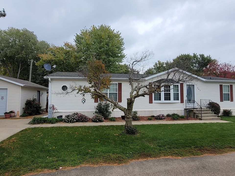 Very nicely maintained 2003 mansion model double wide. Almost 1,500 sq ft of living space. Including stove, refrigerator, dish washer, washer & dryer, Oak cabinets in kitchen and vaulted ceilings. Dining area with built in hutch. Mansion bedroom has walk in closet and private bath with garden tub. 10 x 11 office has French doors and could be fourth bedroom. 10 x 18 patio and 8 x 10 shed.