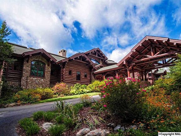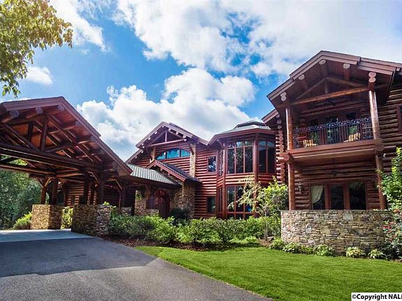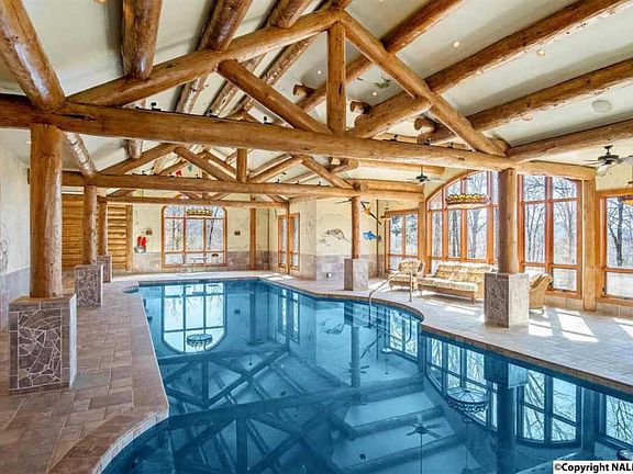 Angelwalk is the most breathtaking Alpine Log Home in the South. On 176+ acres, every distinguishing detail of this inviting sanctuary, down to the antique pine floors, has been thoughtfully chosen. 8 bedrooms and 13 baths (including master wing with private morning kitchen and his/her baths) are designed across 2 finished levels with an apartment over the 5 car garage. Unique features include hand-painted Italian sinks, lofted wood beam ceilings, heated indoor pool, carved mahogany doors, elevator, custom stained glass. Enjoy multiple decks, gardens, stables, trails, bonfire gazebo, riding pasture, shooting range, trails, creeks and deer. Near Huntsville, Birmingham, Nashville & Atlanta.