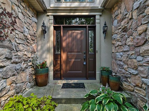Beautiful stone front,contemporary home in cul-de-sac w/exceptional landscaping that provides a private setting. Greatroom w/vaulted ceiling,gas FP w/ shelving on both sides, two sky lights. Open Kitchen has cherry cabinets w above & under lighting, granite counter tops, SS appl, D/R w/entry thru French doors has cathedral ceiling and stately columns that enter to marble floor Foyer boasting an exquisite glass chandelier and wall fountain. 1st floor MBR has tray ceiling, walk-in closets;Master Bath has double vanity,corner shower,soaker tub. 2d floor has 3 BR,full Bath,including one loft BR or office area that overlooks entry and one large BR w/private access to the bath. The Sunroom has heating/AC for all seasons; connects to a Deck with contemporary railing/deck lighting.The exceptional lot provides direct access to both front and rear streets. Sound system throughout, 1st floor Laundry Rm,2-car Garage. The Basement has 8' ceilings,roughed in plumbing, ready to be finished.