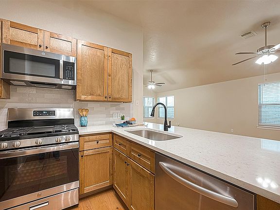New fireplace surroundHigh ceilingsHardwood flooringUpdated wood cabinetsStainless steel appliancesTile flooringGorgeous quartz countertops