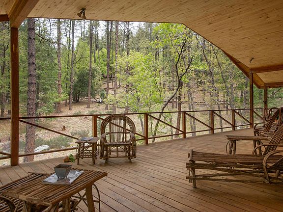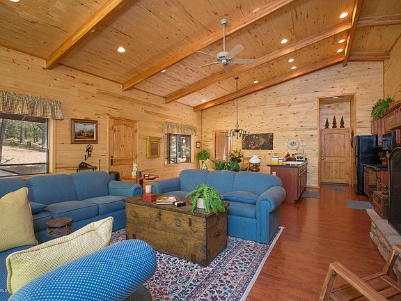 Amazing retreat in the tall pines which backs to the National Forest. At 6952 feet in elevation, you will enjoy the breath taking solitude and cool temps of a true getaway. Cabin contains 1360 sqft all on one level and sits on 2 acres. Open floor plan includes 2 master suites with full bathrooms, Vaulted and beamed ceilings feature aspen tongue and groove detail and 3 skylights. The large, wrap around, covered cedar deck will completely sell you as it contains as much square footage as the home. Cherry cabinets, cherry Pergo flooring,quartz counter tops and a walk in pantry adorn the open kitchen. 2 Sided, stone, wood-burning fireplace allow you to enjoy the fall and early winter months in style. Completely electric home with nice 2 car garage as well. Private well pumped 15gpm at drilling