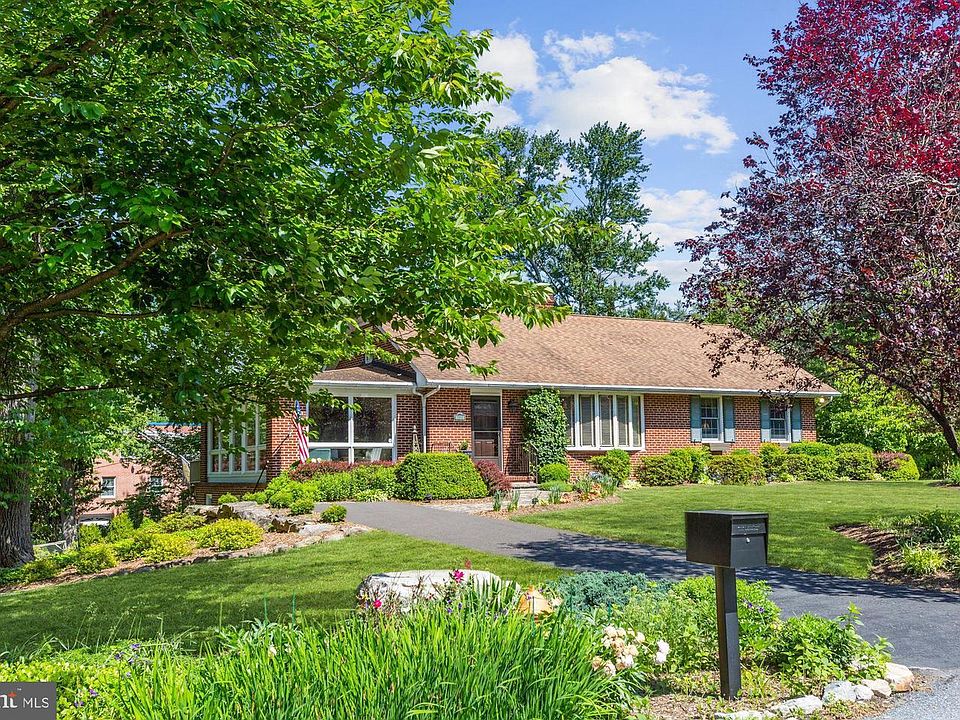 Beautiful Brick Rancher on a private corner lot boasting light-filled interiors and gleaming hardwood floors! Spacious living room embellished with lofty casement windows, custom window coverings, and balcony access; Dining room graced with a stunning bow window, brick profile fireplace, chair railing, and crown molding; Eat-in kitchen highlighted with sleek appliances, upgraded countertops, ample cabinetry, and casual dining area; Primary bedroom, two additional bedrooms, and full bath conclude the main level; Expansive family room adorned with a stone profile wood stove, private office, access to the enclosed porch and garage, full bath, laundry room, and storage complete the lower level; The exterior features beautifully landscaped grounds, extensive hardscape, stone patio, balcony, enclosed porch, secure storage, garden arbor, bridge, variety of perennials, expansive private corner lot, 2-car attached garage, backs to trees and creek; Complete outdoor oasis! A MUST-SEE!