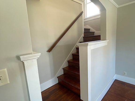 2 Bedroom 1 bath 2 story home with a front porch and detached garage. Hardwood floors, light colors, clean. Get out of your apartment and get into an entire house of your own! Call for a showing.