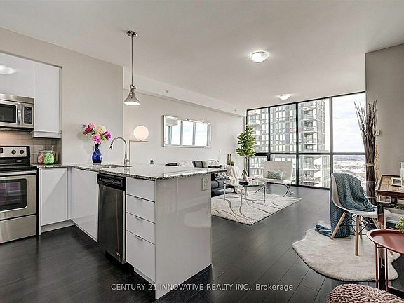 **Location, Location, Location** Welcome Home To This Absolutely Stunning 1 Bedroom Plus Den Condominium. Beyond The Warm Entryway, The Home Flows Into A Thoughtful Open Plan Layout Flooded W/ Natural Light, Showcasing 9 Foot Ceilings, Floor To Ceiling Windows and Stunning Cityscape Views. Contemporary Kitchen W/ Breakfast Bar + Granite Counters + Stainless Steel Appliances. Generous Primary Bedroom W/ 4Pc Ensuite, Spacious Den, 1 Underground Parking Space And 1 Locker Included. Mins To Ikea, Walmart, Costco, 400/407, Walk To Subway Station + More!