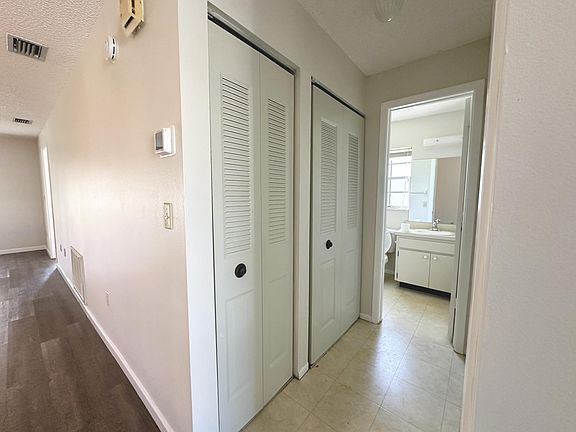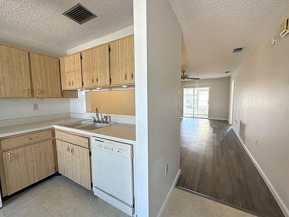 Welcome to this charming 2-bedroom, 2-bathroom end-unit villa in Veterans Villas. This home offers a full driveway with space for two cars, newer laminate flooring in the living and dining areas, and newer carpet in the bedrooms. The property features light paint throughout, open living and dining area, and an enclosed back porch for year-round enjoyment. Additional conveniences include stackable washer and dryer hookups. One pet is permitted per HOA guidelines.