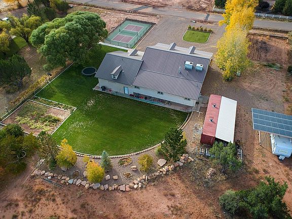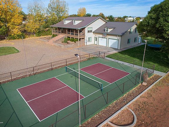 Magnificent 5700 sq ft 6BD/3.5BA home on 1.52 ac. Guest quarters downstairs, w/access directly through the oversized 2 car garage, includes full kitchen, utility room w/washer/dryer, 3BD/1BA, large pantry (food storage), & newly remodeled. The main home w/large beautiful kitchen (hardwood floor...oak), also has large pantry, oversized utility room w/washer/dryer, wide open family room w/gas fireplace, 3BD/2.5BA, & nice sized, functional, office. Outside equally spectacular...full sized Pickleball court w/lights, solar panel array powering the property w/power to spare...sold to APS (power company) & APS sends them a check (no elec bills). Array also a great RV cover. Beautiful backyard, w/garden area & fruit trees (apple/peach). Wonderful wraparound deck to relax on. 8x40 Conex (cont)...