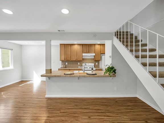 Tiled countertopsGas rangePantry closetDual pane windowsRecessed dimmable lightingLaminate wood floors