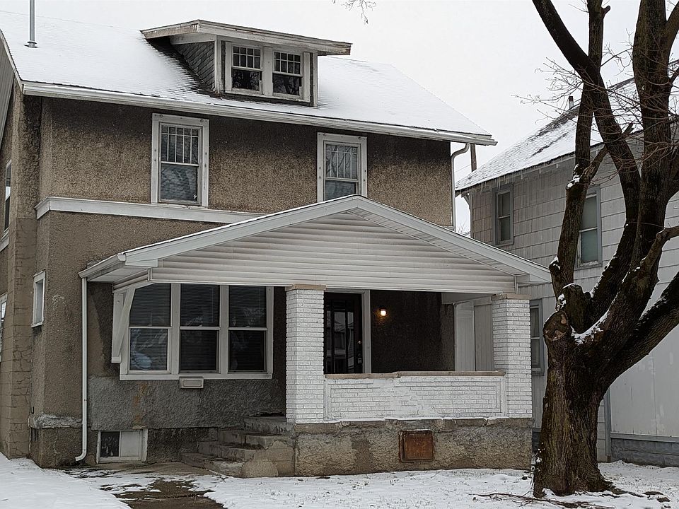 This property will be sold AS IS. With fresh paint throughout, including the hard wood floors, this home is move-in ready. Original woodwork will be discovered throughout, with beautiful leaded glass doors, built in bookshelves flanking the fireplace, built in linen closet in the upstairs hallway, and more! This functional three bedroom home with one full bathroom upstairs is perfect for City living, with a minimal yard. A covered front porch welcomes you in and the back utility room ands function. There is a side entrance leading to the unfinished basement. Bedroom dimensions are an estimate.