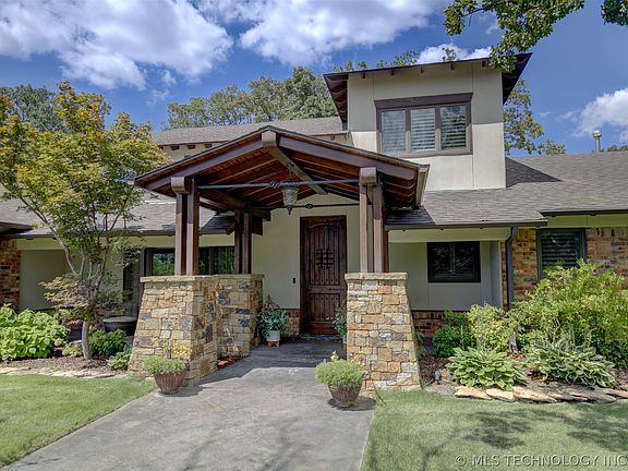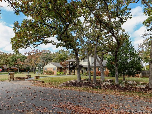 You will love this primarily one-story home with lovely curb appeal and interior open concept nestled by mature trees on a fantastic half acre corner lot near Southern Hills CC! Recently renovated with newer plumbing, electric, windows hardwood, gourmet kitchen with stainless steel appliances, lux master suite with see through fireplace to spa bath, walk-in closet and more! Unique attached quarters with private entrance and half bath is perfect for a home office, exercise or art studio, or future pool house! Split side load garages include 3rd bay with heat & air. Large open concept includes living, dining, kitchen w/ breakfast nook, wet bar, and great room with cozy gas log fireplace. Upstairs boasts a game room, bedroom, and full bath. There are 2 laundry areas, 2 bedrooms down, 1 up, high energy efficient HVAC and 4 ring smart home cameras, floodlights, sprinkler system, full privacy fencing, professional landscaping with maintained mature trees! Additional finished out room w/half bath is 208 sq ft, which is in addition to the 3,121 sf for a total of 3,329 sq ft living space. The 1-car garage bay also has Heat & Air. Don’t miss this move in ready, spectacular estate!