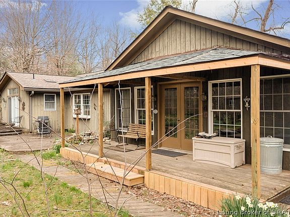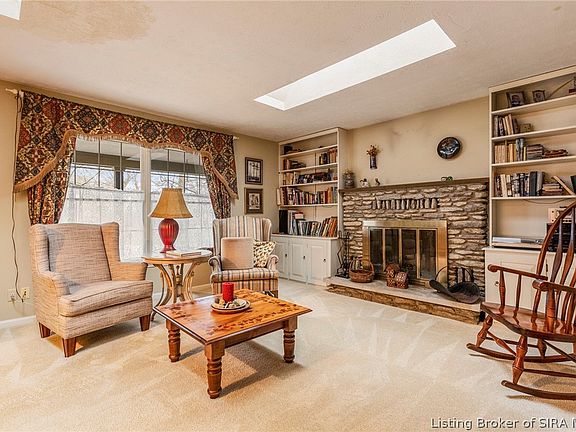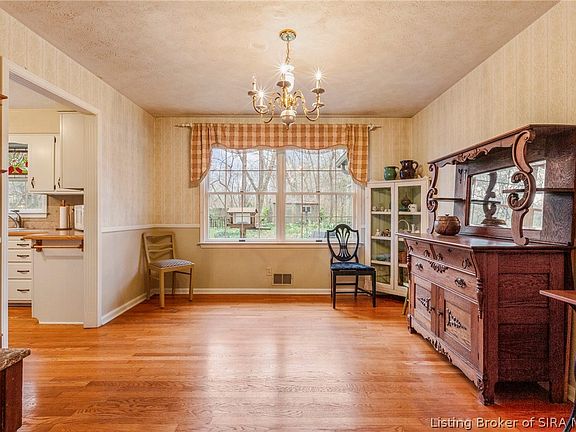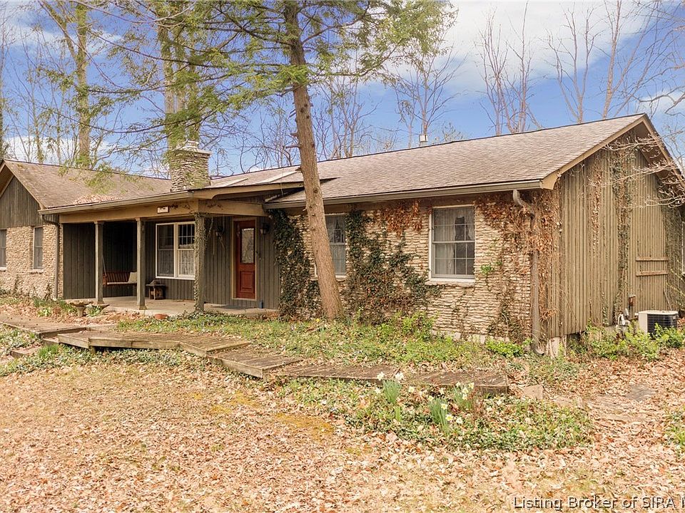 Welcome to this charming home in Sellersburg! This beautiful ranch home nestled on a cul-de-sac boasts 3 bedrooms, 2 bathrooms, and a serene wooded lot. Step inside to discover character-filled features including a wood-burning stone fireplace and built-in bookshelves in the formal living room, and hardwood floors throughout much of the home. Natural light floods the spacious family room with its cozy wood stove, while the formal dining room offers the perfect setting for gatherings. Relax with coffee and a book or take in all that mother nature has to offer on the large deck, with recently redone covered area. The full unfinished basement, professionally stabilized and waterproofed by United Dynamics, offers endless possibilities for additional living space. Retreat to the owner's suite with vaulted ceilings, exposed beams, a private bathroom with double vanity and large walk-in closet. The side entry garage is spacious with room for 2 cars plus storage shelves and workspace. With a custom-made front door showcasing beautiful glasswork by the owner, this home is a true gem. Don't miss out on the chance to make it yours! Hot tub remains but seller is not aware of the condition. Hanging stained glass and stained-glass piece in front of upper windows in primary bedroom to be removed. All measurements and sq. ft. approx.