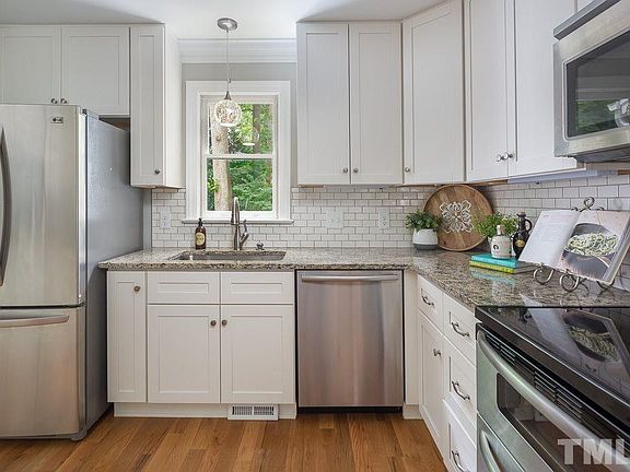 YOU'LL LOVE THIS ONE! Beautifully UPDATED home on quiet CUL-DE-SAC in highly desired DURANT TRAILS! Charming ROCKING CHAIR FRONT PORCH. NEW SOLID ¾" WOOD floors on main level, NEW PLUSH carpet on 2nd. GRANITE counters, neutral paint, STAINLESS appliances, stunning MORTAR WASHED wood burning fireplace. Large tiled master shower, BARN DOOR closet. Large composite DECK overlooking PRIVATE, partially WOODED backyard. A MUST SEE! Low HOA with pool, tennis, tot lots. Convenient Location!