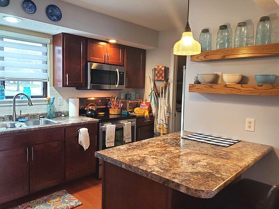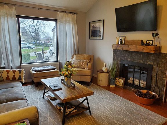 Ranch condo with 2 car garage. 2 bedrooms, 1 Full bath. Nice updates include flooring throughout, newer cabinets, counters, tiled backsplash and stainless steel appliances. Newer washer and dryer will stay. Has new Hot water heater. Note, the large cabinet next to Fireplace is attached and will remain. HOA monthly fee is $140. but HOA has temporarily reduced it to the $100. as they had an overage in their accts. Not known how long the $100. will remain the amount.
