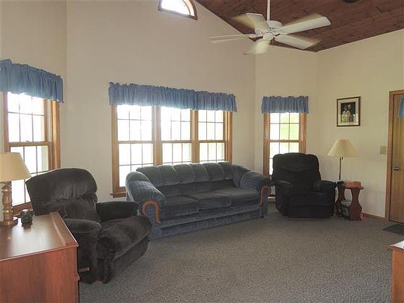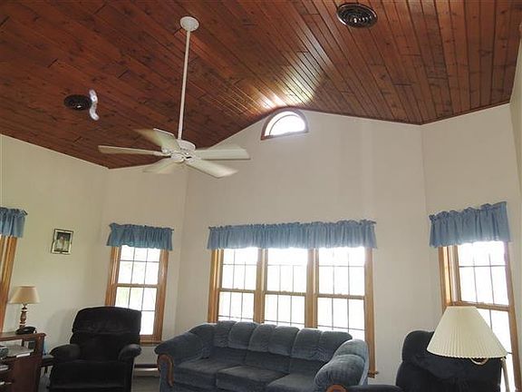 Ranch home on almost 3.5 acres w/ a 2 car attached garage and 2 other garages, which are heated, measuring 48x28 and 48x24. Wrap around porch w/wonderful views. Newer roof, chimney, well pump, septic tank, driveway, garage doors, indirect hot water and wood burner. 3 bedrooms, 2 bathrooms, vaulted ceiling in great room w/2 sets of French doors and wood ceiling. Huge kitchen and dining area with wood burning fireplace. Lower level has tons of space to finish. Workout room equipment is negotiable.