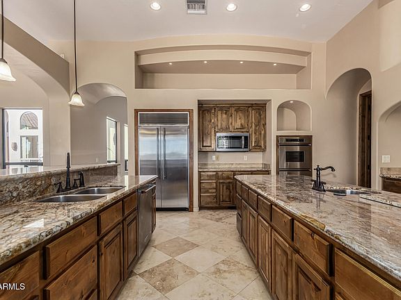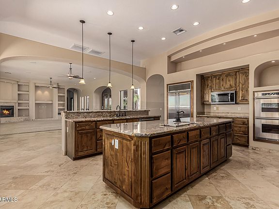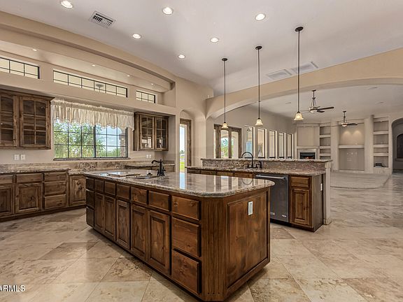 The gourmet kitchen is a chef's dream, featuring a 48'' Wolf stove, four ovens, and a spacious butler's pantry. The home offers 4 spacious bedrooms, a 5-car/RV garage, and a center courtyard for tranquil outdoor gatherings.