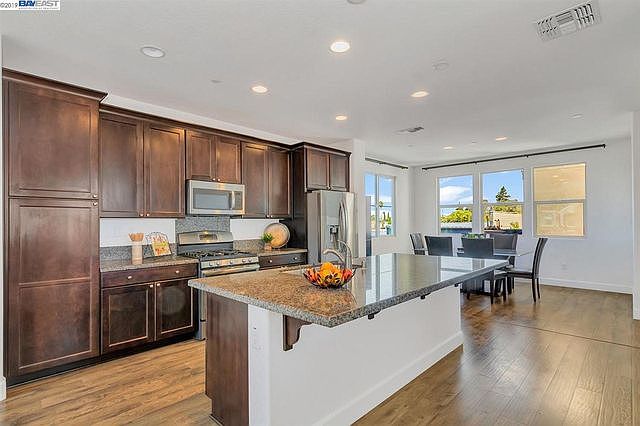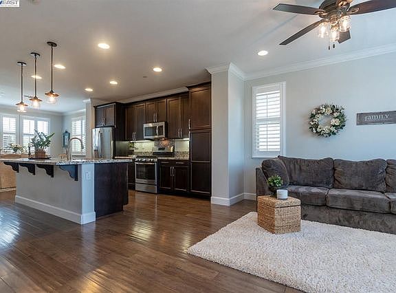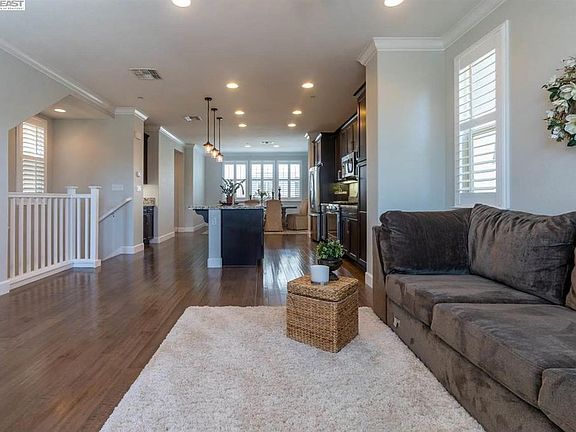 This biggest unit of the whole complex is situated in a beautiful community, close the heart of Livermore downtown, walking distance to ACE train, restaurants, movie theaters, shopping, weekend entertainment and so much more. One en-suite on the first floor with hardwood floor, 2nd floor is an open floor concept offers a spacious great room. It is airy and bright with the crown moldings and Plantation shutters through out. The kitchen is equipped with all the SS appliances, big island, ceiling fans, backsplash, granite counters, high-quality hardwood floor/ tile floor/ Berber carpet throughout. This home is an ideal place for the families who enjoy the peaceful suburban lifestyle with a hue of city characteristics since everything is just within walking distance!