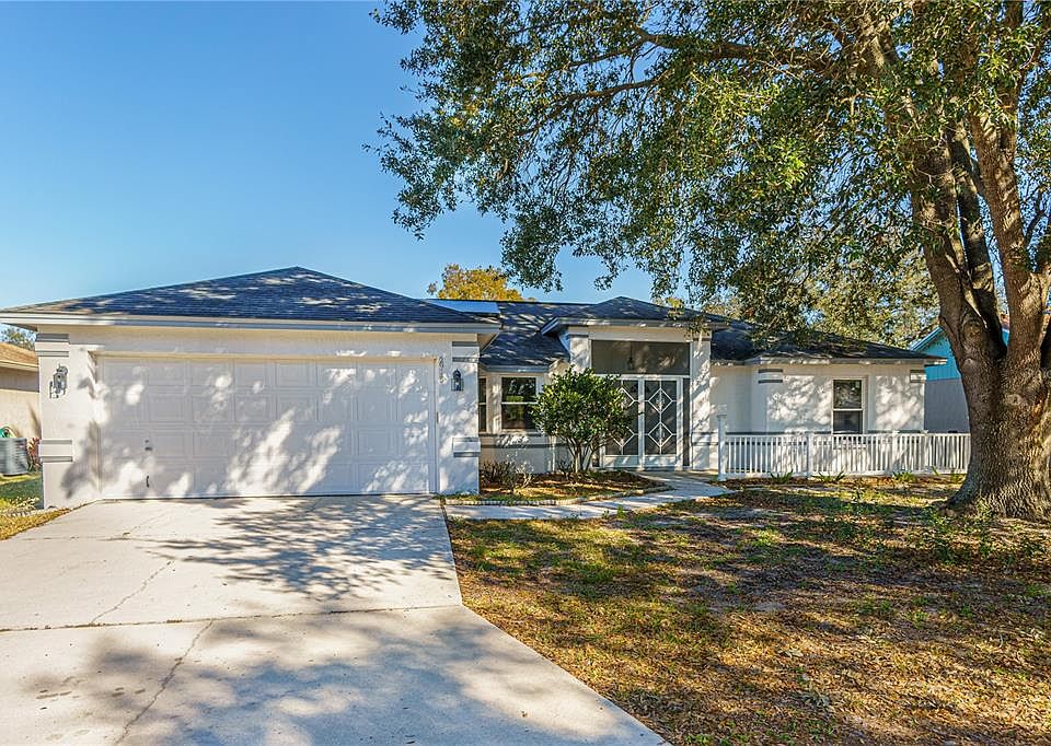 This BEAUTIFUL POOL home has been pre-inspected and is waiting for its new owners. You will be able to tell that this home was well maintained and loved by its previous owner. You will be drawn straight to the pool area, which is on the north side of the home, so you have sun all day long while enjoying your swim. No worries, the pool is solar heated for those cooler months. You have plenty of space to entertain with the large covered lanai that over looks the pool and spacious, fenced bakyard. The pool was resurfaced in 2015. All windows and sliding the sliding glass door were replaced with energy efficient windows in 2014. The roof was replaced in 2015. Solar panel was installed in 2015 with the new roof. The pool deck area was recently updated with new patio pavers in May of 2021. The home exterior was painted in 2021 along with new laminate flooring and updated baseboards. The entire interior of the home was repainted in December of 2022, also installed all new door handles through out the home. The kitchen features a small eat in area and a large window for creating a lot of natural light for your morning coffee. To add to the abundance of kitchen space there is a formal dining area that allows the whole family to gather around the table. The open concept living room has a great view of the pool area through the sliding glass doors that pocket into the exterior wall. Couple that with the vaulted ceilings and it creates a very spacious area. This split plan home gives the owners their private area on one side, while bedroom 2 & 3 share their own full bathroom on the opposite side of the home. The 2 car garage is super spacious and enters directly into the kitchen for added convenience. The neighboorhood has very low HOA fees and the neighborhood is conveniently located just miles from the I-4 interstate, and only 35 minutes from the Orlando theme parks.