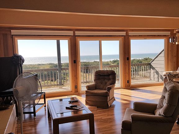 Ground level oceanfront condo with appliances and furnishings. Wood fireplace, open concept living/dining/kitchen. Large bedroom with large walk-in closet. Washer and Dryer in unit. Expansive windows reveal incredible ocean views. Unit includes a 7X9 storage unit and 11X22 garage with electric door opener. Most furnishings included in sale. HOA fee includes cable, wifi, water, sewer, garbage and landscaping.