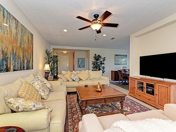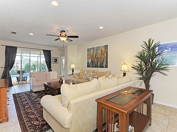Beautifully maintained home set on a quiet cul-de-sac in the Sugar Mill Lakes community. It has 3 bedrooms, 2 bathrooms, great room, den/office, breakfast nook and dining area. With plenty of space for entertaining, the home has a gourmet kitchen with granite counter tops, stainless steel appliances and maple cabinetry. Communal living area is all tiled and the three bedrooms are fully carpeted. House is full of recessed lighting and upgrades including coffered ceiling in the master bedroom and granite vanity tops in the master bath. The den has cherry colored laminate wood flooring and double french doors. The lanai was extended in 2015 with the addition of a pool. Together with a water view and colorful landscaping this home offers comfort, privacy and tranquility.