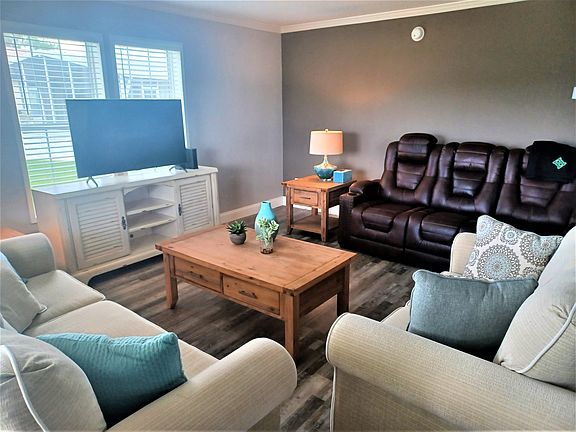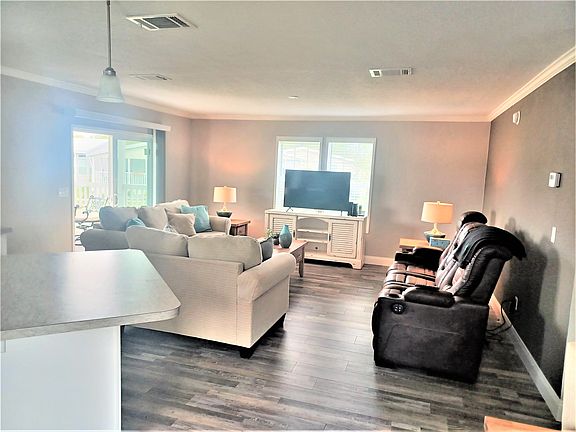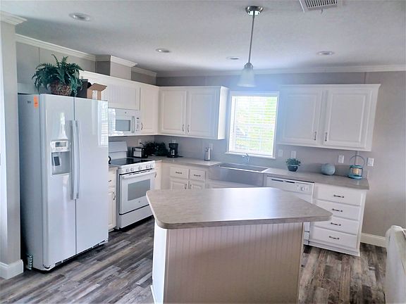 *** This home is located within a 55+ community; age restrictions apply.***This 2020 Jacobsen Home offers 1344 sq. ft. of living space with 3/2 and an open floor plan great for entertaining. The kitchen features a stainless steel farmhouse sink. Enjoy a separate laundry room with upgraded washer and dryer, plus lots of storage space. Step outback to the rear patio to enjoy the view. The wide driveway easily accommodates 2 cars! The home, all of it's stylish furnishings, the appliances, roof, A/C and water heater are just 3 years old, and a water softener 2021. It's being offered TURNKEY ... just bring your suitcase and enjoy!