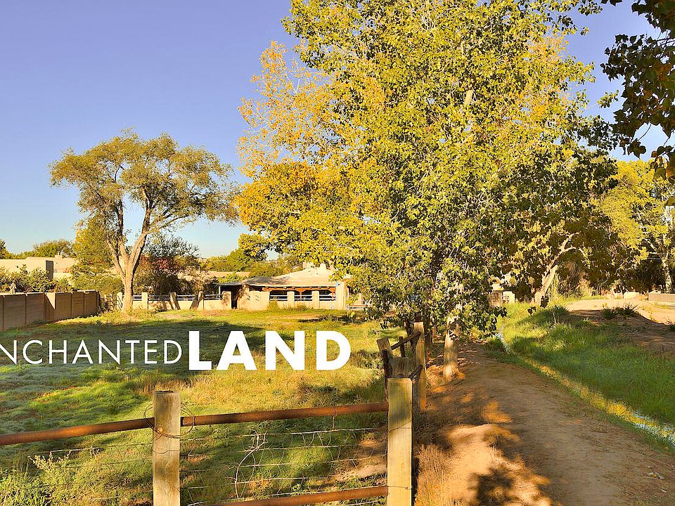 ENCHANTED LAND, READY TO BUILD! A unique opportunity to become a neighbor and owner in an intimate New Mexico heritage compound right at the center of it all! The subdivision process is complete, utility and road easements are in place and a new Plat is approved and recorded. The former horse corral is a short walk from the Bosque trail, a five-minute drive to Old Town and close to everything. The 0.35 acre leveled lot, is set back from the street and surrounded by mature trees and an acequia which irrigates the entire property. For the benefit of all owners, certain Deed Restrictions are in effect to preserve the beauty and integrity of the property. Adjacent Lot A-1 with adobe home, is Under Contract (see MLS#1055793). DO NOT ENTER property without a confirmed appointment.