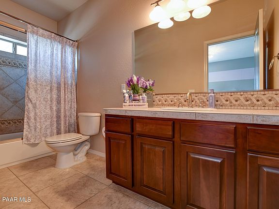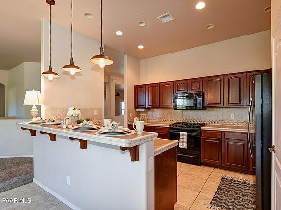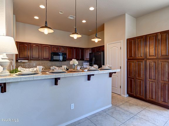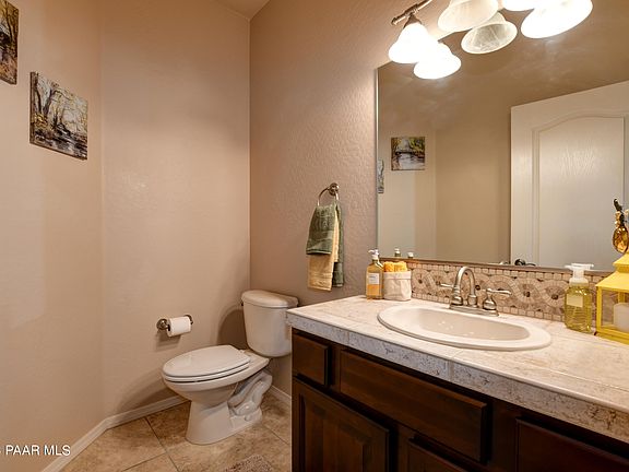 This elevated home has it all! Three car garage, level drive, spacious main level living with gorgeous views of the Dells and Granite Mountain. Primary and Guest suites, both with full private bathrooms, on the main floor. Large eat-in kitchen, with maple cabinets, stone tile, breakfast bar, pantry, leading to generous living room with fireplace, light open floor plan make this a desirable place to call home. The lower level has 2 bedrooms, a full bath, and a living room with its own fireplace, separate entry, ideal for multi-gen living. The wrap-around porch and covered front patio offer plenty of space to maximize enjoyment with morning coffee or sunset cocktails while taking in the gorgeous views. A Must-See property in the all-custom home Summit neighborhood in Prescott Lakes.