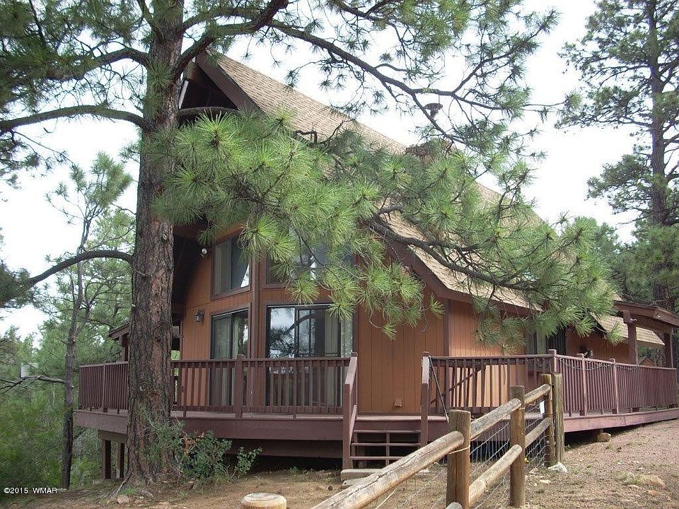 Peace and tranquility are just a few of the words that describe this 3br, 2ba + loft chalet nestled among huge towering Ponderosa Pine trees on a 3/4 acre homesite! Wraparound Trex deck on 3 sides (2 covered), partially fenced yard for fido or the kids and awesome views. Wood floors & carpet in BR's, rock faced woodburning fireplace w/insert for efficiency & central propane/gas heat too. Loft overlooks the greatroom & wall of windows + great for overflow guests. Private road w/low flow traffic. Priced to sell!
