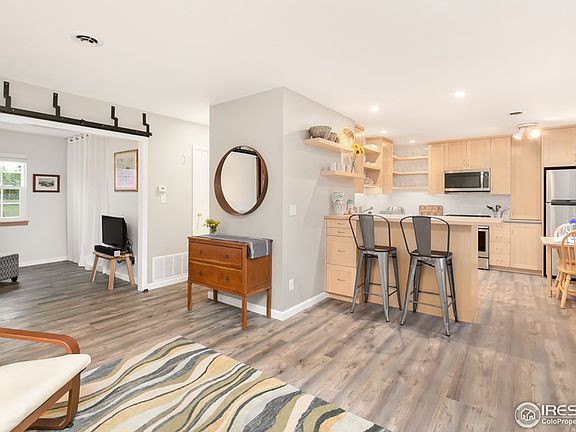 This great foothills duplex-half lives big-thanks to custom renovations! The large living area is now a flex space with custom barn doors closing off a bedroom area or opening up for parties! In the u-shaped, updated kitchen, a peninsula features kitchen storage on the inside, office storage on the outside and a butcher block top perfect for prep! Durable quartz counters top the other cabinets. Gray plank flooring and a lovely updated bath add appeal. Storage shed in fenced backyard with patio!