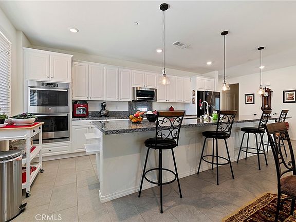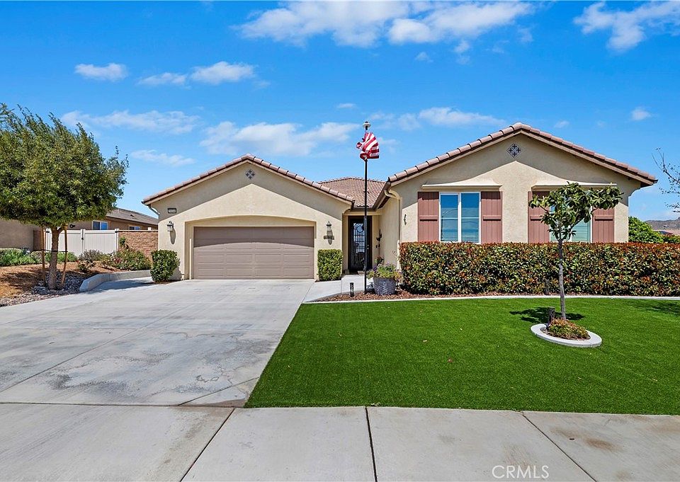 This Beautiful Residence is located in the stunning community of "Five at Heritage Heights" It is a spacious single-story pool home that sits on a highly desirable corner lot comes with solar already installed, has 4 good size bedrooms, 2.5 bathrooms and has 2,686 square feet of living space. The amenities include a wide-open living space complete with gourmet kitchen, nook and great room with plenty of room for entertaining. Enjoy the warm Southern California weather in the California covered patio which has mechanical shades to close when you prefer to relax in a comfortable enclosed patio. This amazing home has a luxurious Fullsize in ground swimming pool/jacuzzi with three waterfalls flowing down a beautiful tile wall that bring a peaceful sound to have a relaxing California afternoon while swimming. During the cooler nights, you can warm up by the fireplace that's included in the great room. The kitchen has stainless steel appliances, granite countertops, upgraded cabinetry, walk-in pantry and an extensive island with plenty of counter space for all your cooking and baking needs. The dining room is perfect for holiday celebrations and family gatherings. The secondary bedrooms in this gorgeous home are located near the front of the home. The three bedrooms share a full secondary bathroom complete with dual sinks and bath/shower combo. The master suite located off the great room includes a spacious master bedroom, master bathroom and walk-in closet. The full bathroom features dual sinks, shower and luxurious soaking tub perfect for any time of day. This home has energy-efficient features such as LED lights throughout and ceiling fans as well. You do not want to miss out on this home! It will go fast!!