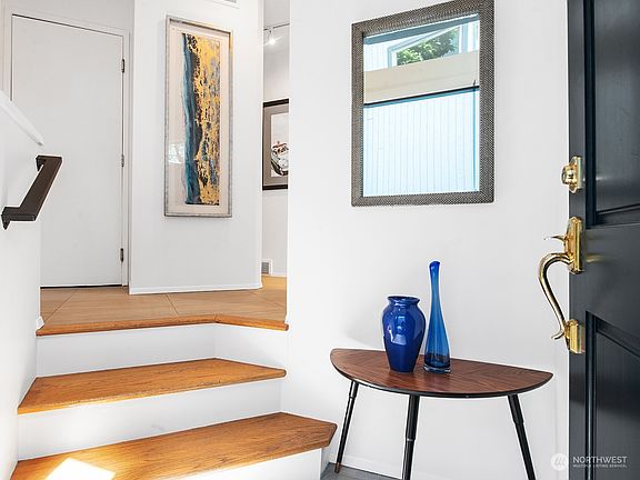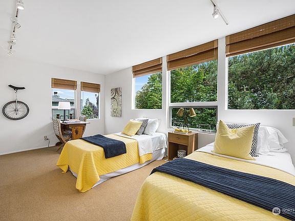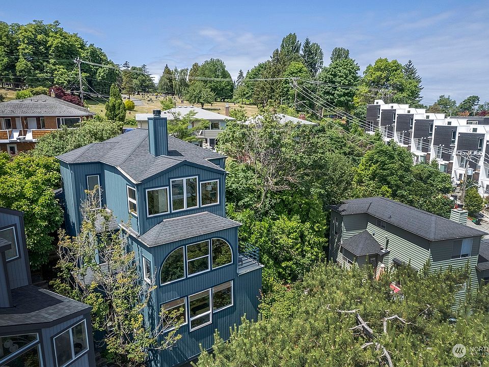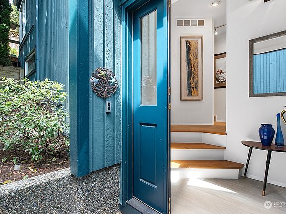 Sited on a quiet, private drive, this Northwest Contemporary in city oasis will enchant. Natural light pours in from every window and offers above the treetops views of the Cascades and Fremont. A winding stairway connects the floors from the upper primary retreat with sitting room, walk through closet and renovated bath down to the basement two car garage with storage and workspace. Open flow on the main floor is designed for entertaining. A chef’s kitchen with eating bar, adjacent family room, dining and living area with see-through fireplace spills out to a magical garden for al fresco dining or relaxation. Centrally located near Rogers Park, Seattle Pacific University, easy transit and a short walk over the Fremont bridge to amenities.