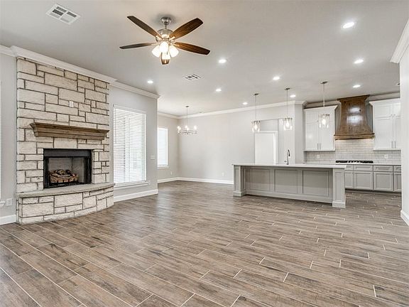 Designed for everyday living and entertaining, the open-concept layout showcases a warm gas-log fireplace, abundant natural light through grand windows, and elegant wood-look tile flooring throughout. The gourmet kitchen is equipped with stainless steel Frigidaire appliances, a large pantry, and a seamless connection to the dining area.