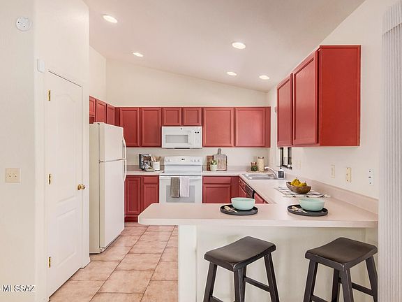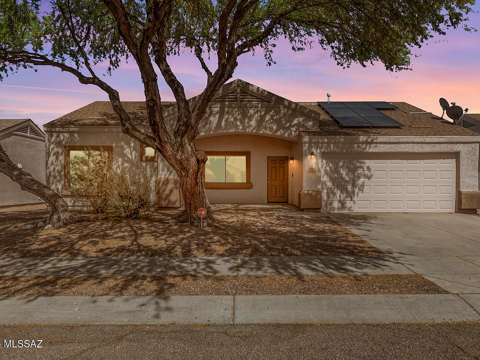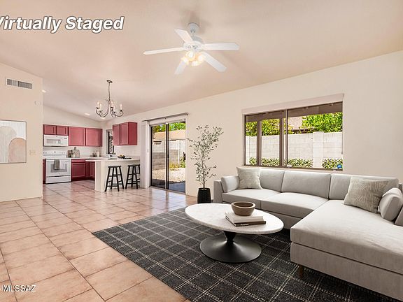 Clean & beautiful 3 bed, 2 bath home w/ a spacious, airy feel features split floorplan, soaring ceilings, abundant natural light & tile throughout. You'll love the open-concept kitchen w/ custom terracotta stained cabinetry, built-in appliances, pantry closet & a breakfast bar. OWNED SOLAR panels installed in 2023 means LOW ELECTRIC BILLS w/ NO EXTRA PAYMENTS! The main bedroom serves as a peaceful retreat, complete w/ TWO walk-in closets, en-suite bathroom & direct access to the hot tub on the extended covered back patio. Lovely community with low $29/MO HOA dues conveniently located near DMAFB, dining & shopping. All appliances included! Don't miss this move-in-ready home.