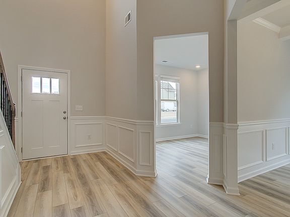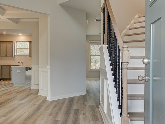 Covered front porch.Open concept kitchen with quartz countertops and an island overlooking breakfast area and family room.First level guest suite.Dining room with coffered ceilings.Primary suite with large walk-in closet, dual vanity, tub and walk-in shower.