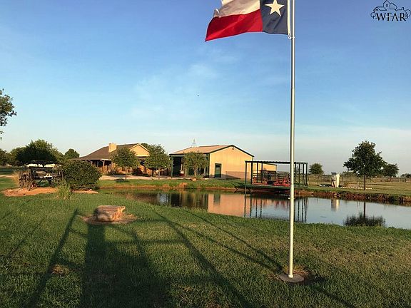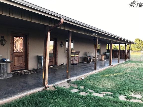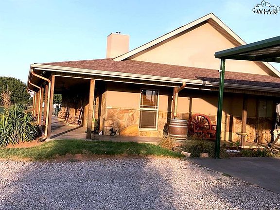 This house is like new with little wear. Stucco and rock exterior with a 9' covered wrap around porch. 2 car garage with 600sf fully furnished apartment with storm shelter. House has wood flooring, stainless steel appliances, stainless steel farm sink with granite counter tops. Shaker style notty alder cabinets light oak stain. lots of tile in both bathrooms with 8 foot tiled shower in second bath. Beautiful interior décor with a western theme. 600 sf barn with water, bathroom. Additional out buildings with
