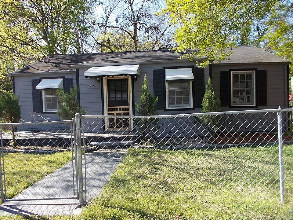 Drink your morning coffee on the large front porch or enjoy the sunshine. 3 bedrooms/1 bath. No carpet in this home--hardwood floors or tile. Living room and large dining area. Kitchen w/stove, fridge and dishwasher. Fenced front yard and back yard. Avail: Now. No pets and no smoking in home.