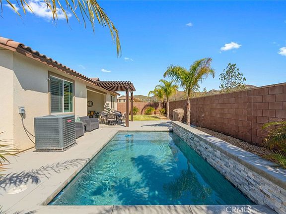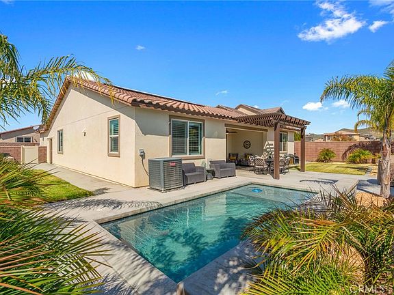 Beautiful 3 Bedroom, 3 Bathroom Single Story POOL Home at the end of the cul de sac in the community of Summerly! The home has over 2,500sq ft living space on a spacious lot with private driveway, bonus room and numerous upgrades. OWNED Solar Panels. OWNED full home water filtration system by PureAgain. Upgraded pool system with UV water filtration, and so many more! Enter the home into the open living space, spacious formal dining room on the right hand side with plantation shutters and chandelier. Wood tile flooring is taken through the entry, dining, living room and kitchen. Plush carpet in all bedrooms and bonus room. Remote controlled Fannation Ceiling Fans are installed in living room, bonus room, and all bedrooms. Gorgeous kitchen is perfect for entertaining with an oversized island open to the living room. Solid granite countertops, stainless appliances, alkaline water drinking system under the sink and custom cabinetry with 2 walk-in pantries. This property provides a true indoor/outdoor living vibe with 3 large sliding glass doors opening to the California Sunroom. Powder room at the front of the hall for guests. Laundry room with added sink. Private primary bedroom separate from the guest rooms with on-suite bathroom huge walk in closet. Spacious guest bedrooms each with walk-in closets. Guest bathroom has double sinks and separated area for the tub/toilet. Backyard is ready for entertainment with an added pergola, private in-ground pool and lots of space to relax and play. Both front and backyard landscaping have drip system controlled by the installed Rain Bird system. Never worry about remembering to turn on/off your outside lights with the Leviton light system. The home has an excellent location situated with easy access to the freeway, shopping and entertainment. 30 minute drive to Down Town Temecula and just over an hour to beautiful San Diego. The community of Summerly has wonderful amenities to enjoy year round including playgrounds, parks, community pool and clubhouse.