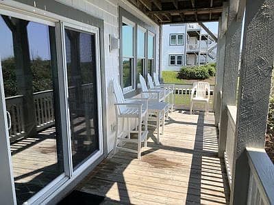 Escape to the shores of Emerald Isle on the Crystal Coast of North Carolina. This Ocean front condominium is only 50 steps from the Atlantic Ocean where the wonders of nature await. Pristine beaches provide sun, surf and relaxation. Fish at the surf line or collect shells as you walk the miles of beachfront. Pods of dolphins swim the shoreline of Emerald Isle, a known favorite location for federally protected nesting sea turtles. Ocean front first floor 2 bedroom, 2 Bath condo sleeps 6. King size master suite with whirlpool tub. Queen size in the second bedroom. Additional Queen Size Cabinet Murphy Bed in Living room . All new mattresses and bedding, linen and bath towels provided. 2 TVs, DVD, Bose sound system, cable and internet. Direct beach access via boardwalk from covered porch adjacent to living room. 2 community pools, tennis court and community grills.